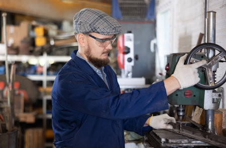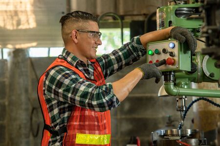 Skillful factory engineer or worker do machine job in manufacturing workshop . Industrial people and manufacturing labor concept .