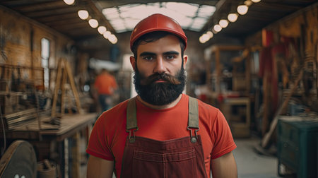 Waist up portrait of bearded factory worker wearing hardhat looking at camera while standing in workshop. AI Generated.