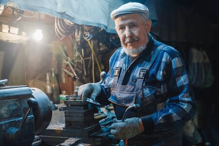 Portrait of an Asian man smiling. Senior craftsman who is skilled in craftsmanship, is controlling, skillfully operating a lathe, is in a small factory that is his family business.