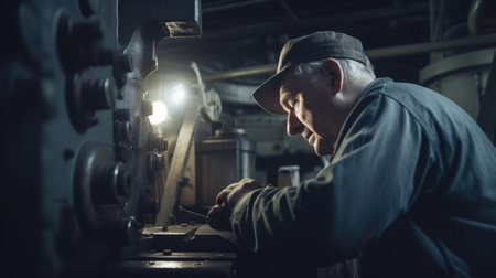 Industrial Worker Male Caucasian Middle-Aged Operating heavy machinery in a manufacturing plant, producing industrial goods in Factory. Generative AI AIG22.