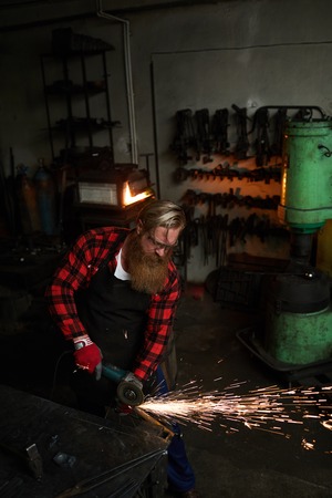 Craftsman sawing metal sparkles all around workshop. Working at noon.
