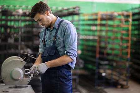 Professional mechanic man is cutting steel metal with rotating carbon blade cutter. Steel industry and workshop concept.