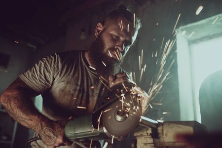 Handsome brutal male with a beard repairing a motorcycle in his garage working with a circular saw. In the garage a lot of sparks and smoke from sawing.