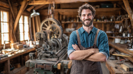 A cheerful craftsman stands confidently in his vintage workshop, surrounded by an array of tools and machinery, embodying passion and dedication to his craft.
