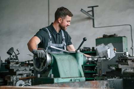 Close up of a metalworker operating a lathe machine, shaping metal components with precision and expertise in a bustling workshop environment