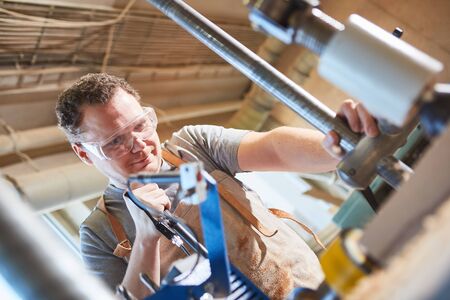 Carpenter apprentice with safety glasses works with wood in the carpentry workshop