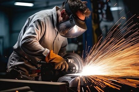 Worker grinding/ welding metal and sparks spreading, industry theme. Generative AI