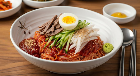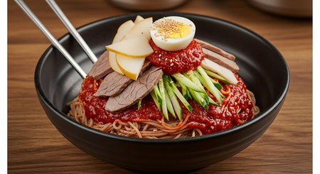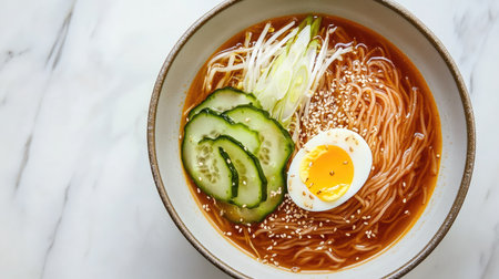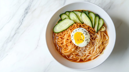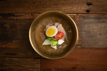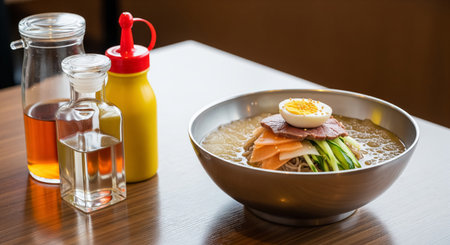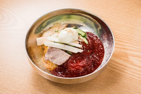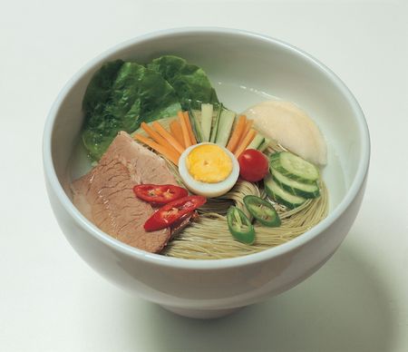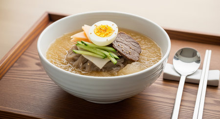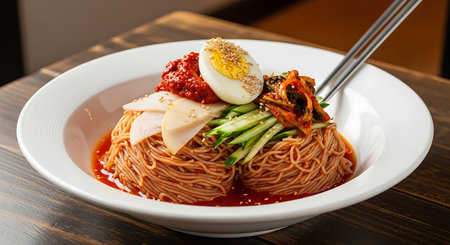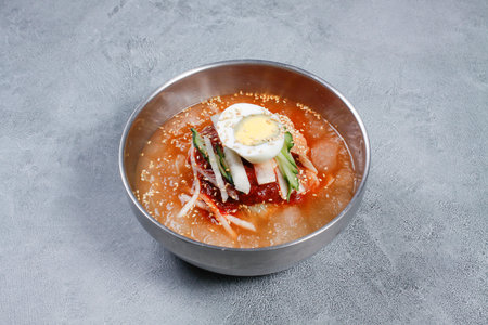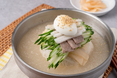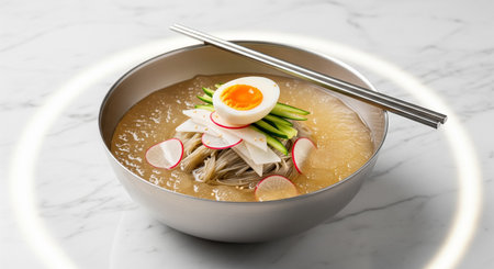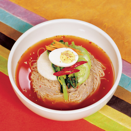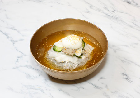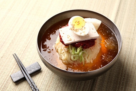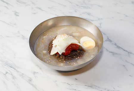 Refreshing Korean cold noodles served in chilled broth with sliced vegetables and boiled egg.