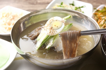 famous Korean cuisine, Mul Naengmyeon, buckwheat noodles served in chilled soup made of dongchimi (radish kimchi) and beef broth