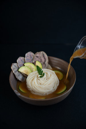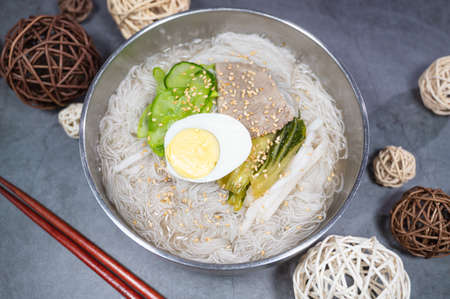 Korean food Cold Noodles, Mul-naengmyeon, close-up shot