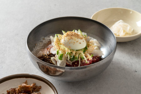 July 8, 2025-Sangju, South Korea-A Various styles Naengmyeon(Buckwheat cool noodles) decorated on the marble table. Naengmyeon or Buckwheat cool noodles is noodle dish of North Korean origin which consists of long and thin handmade noodles made from the flour and starch of various ingredients, including most commonly buckwheat but also potatoes, sweet potatoes, arrowroot starch, and kudzu. Other varieties of naengmyeon are made from ingredients such as seaweed and green tea.