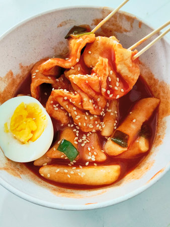 Tteokbokki, classic Korean street food featuring chewy rice cakes, fish cakes, and hard-boiled egg smothered in a sweet and spicy chili sauce.