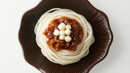 A beautifully arranged white noodle dish topped with sweet sauce and dumplings, showcasing an elegant presentation ideal for food enthusiasts and culinary creativity.