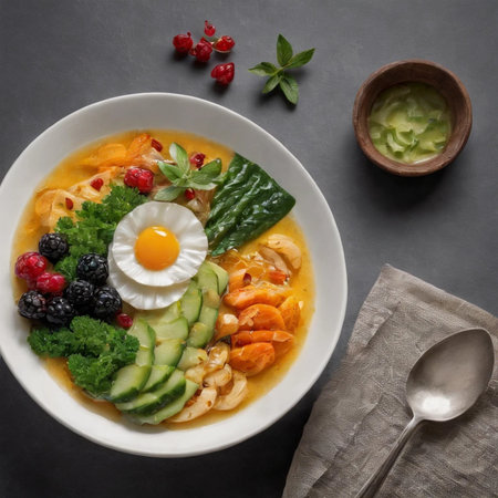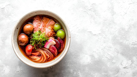 AI Generated. Cold Noodle Soup with Fresh Vegetables and Kimchi featuring Beef