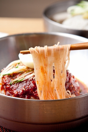 Cold and spicy Korean wheat noodles, milmyeon with chopsticks