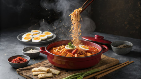 A vibrant image of a steaming noodle dish with soft-boiled eggs, fresh ingredients, and rich flavors, capturing the essence of Asian cuisine in a cozy kitchen atmosphere.