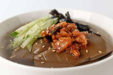 Acorn jelly noodles in cold broth with sprinkled dried seaweed in bowl