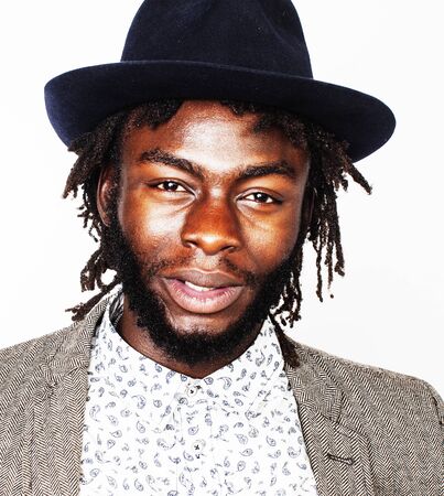 Smiling happy american african man wear stylish hat on white background. Festive and party concept