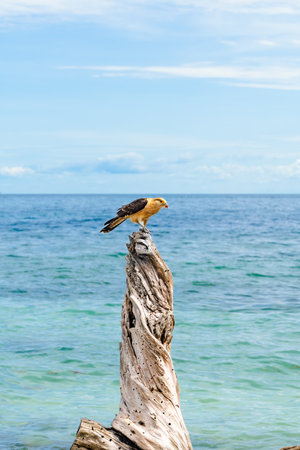 Yellow-headed Caracara facing the sea on driftwood with copy space in Mucura Island, Colombian Caribbean.