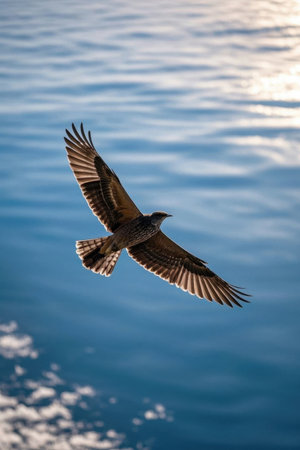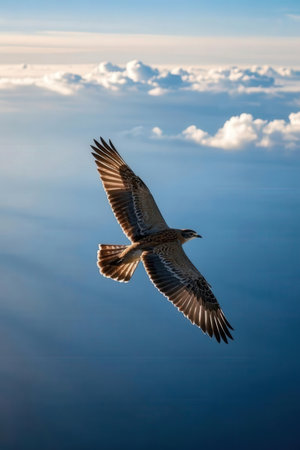 Detailed view of a soaring bird with outstretched wings, capturing its feather details in flight