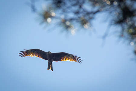 Black kite, spread wings flying in the blue sky above the pine trees top branches