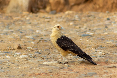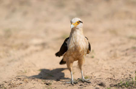 Close up of a Yellow-headed caracara (Milvago chimachima) standing on a sandy river coast, South Pantanal, Brazil.
