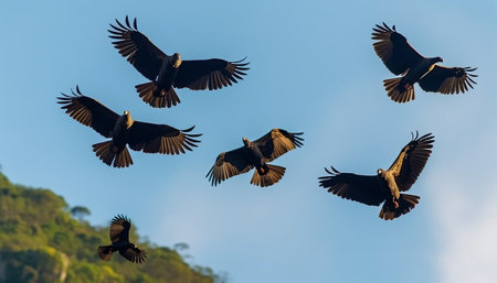 A black kite resting on a grassy hilltop in Monfrage, surrounded by blooming wildflowers and rolling terrain.