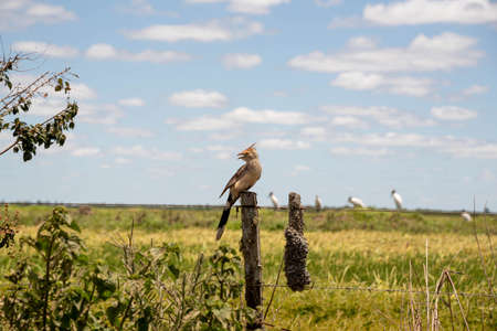 White Anu (scientific name: Guira guira) perched on a fence. Pampa biome fields in southern Brazil. Fauna and Flora. Birds native to South America.