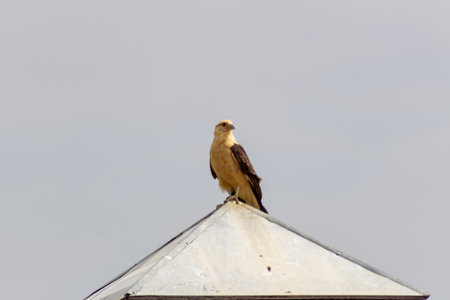 yellow headed caracara, Milvago chimachima is a white headed bird of prey sitting high on a cactus in the tatacoa desert, Colombia, South America