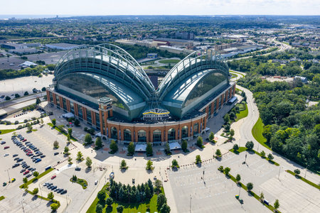 Aerial view of American Family Field in Milwaukee, with its iconic fan-shaped retractable roof open, revealing the home of the Brewers nestled near I-94, surrounded by urban sprawl.