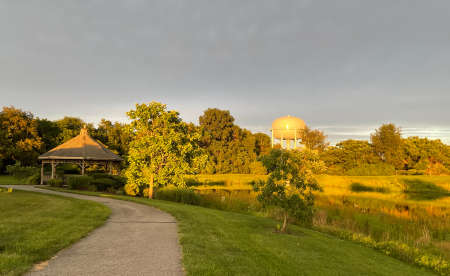 Pathway Leading to a Gazebo with a Water Tower in the Background Near Sunset