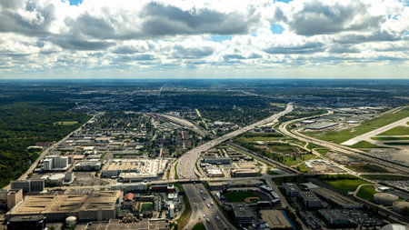 Aerial view of american city at dawn. High-rise buildings, freeway, bay. Sunny morning. Milwaukee, Wisconsin, USA