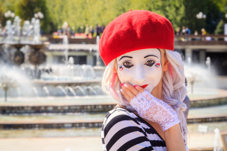 Almaty, Kazakhstan - September 16, 2018. Beautiful mime girl in a mask of a sad clown on a background of blue sky on a sunny day