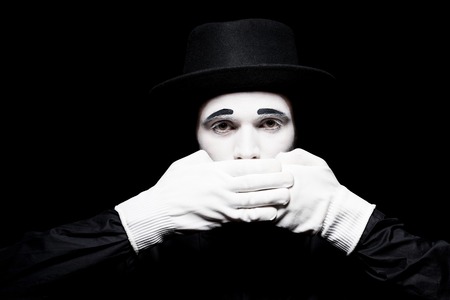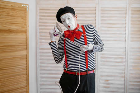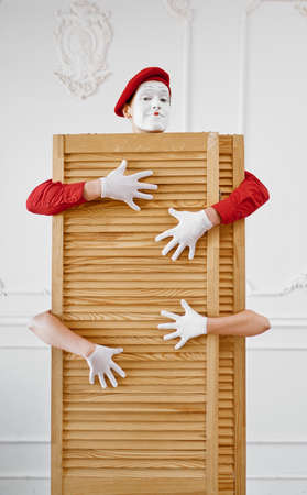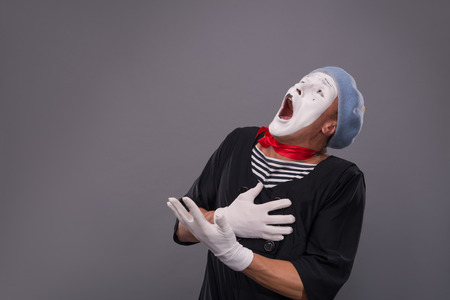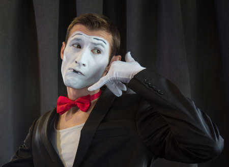 Portrait of a man, artist,clown, MIME. Show something. Mime actor shows different emotions.