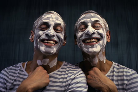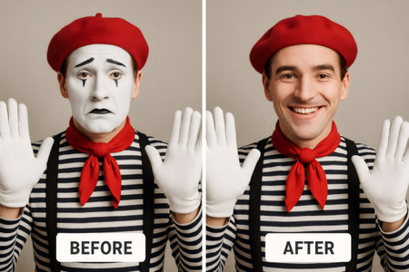 Male mime artist changing his expression from sad to happy, showing a before and after concept