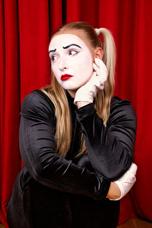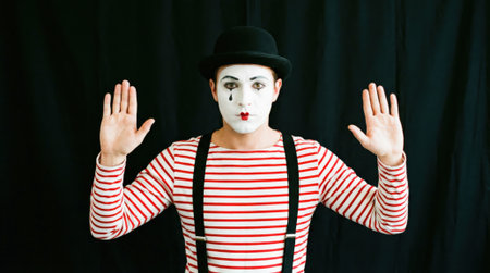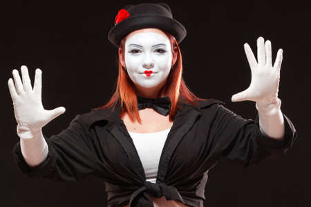 Portrait of female mime artist performing, isolated on black background. Woman is gesticulating with her hands looking at camera