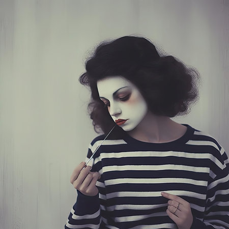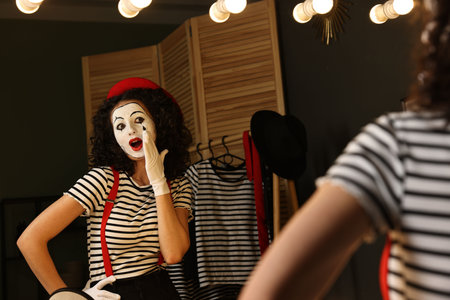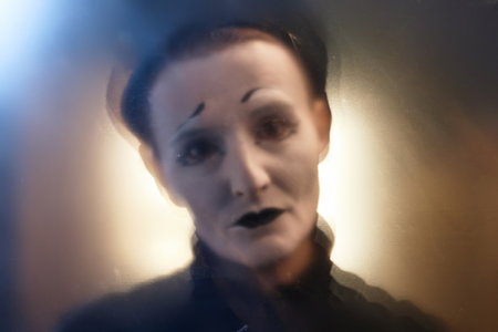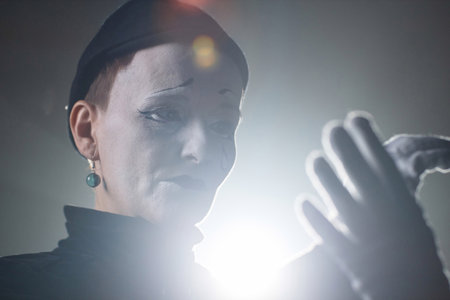 Defocused close up portrait of mime performer looking at camera in stage spotlight, copy space
