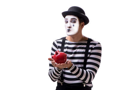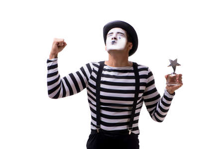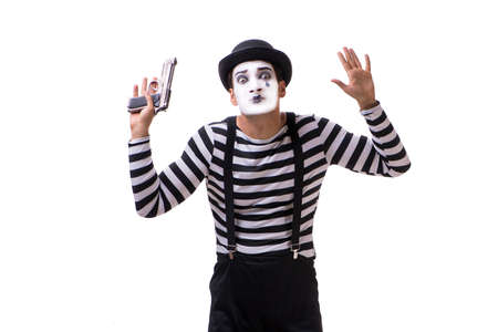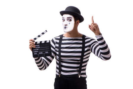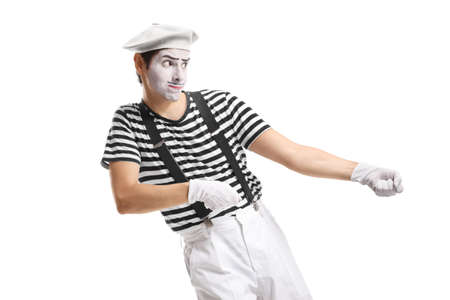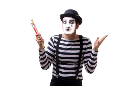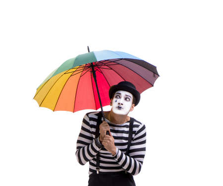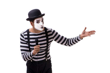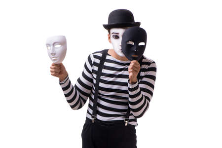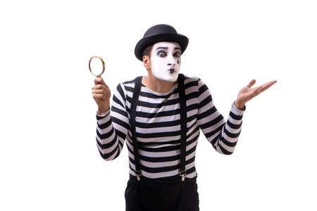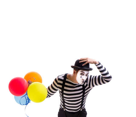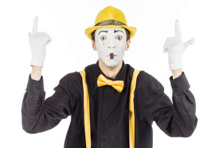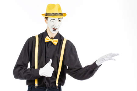 Portrait of a man, artist, clown, MIME. shows something. isolated on white background.