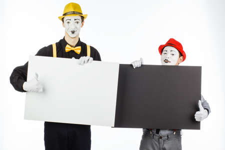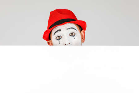 Funny mime in striped gloves and hat, holding a white blank on a black background