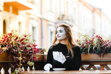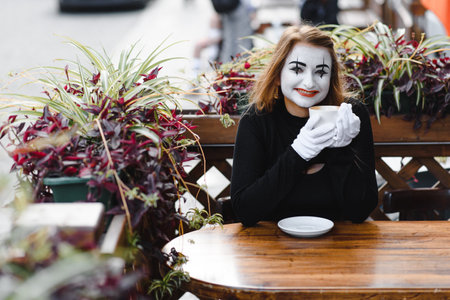 girl mime drinks coffee in paris. Mime comedian drinking coffee.