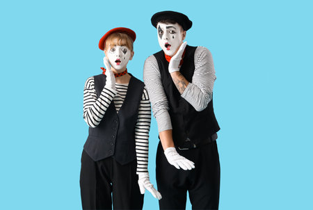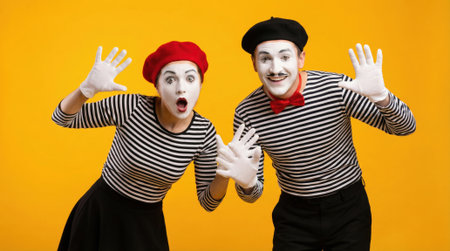 A male and female mime artist with white makeup and gloves. The woman looks shocked while the man smiles, both gesturing against a vibrant yellow studio background.