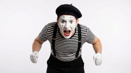 Furious male mime performer in classic costume with beret and suspenders screams in anger, isolated on a clean white studio background.