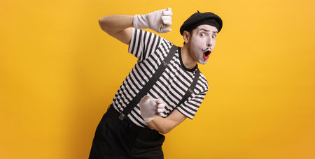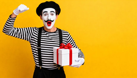 A joyful male pantomime performer in a classic striped shirt and beret holds a white gift with a red bow, making a celebratory gesture against a vibrant yellow studio wall with copy space.