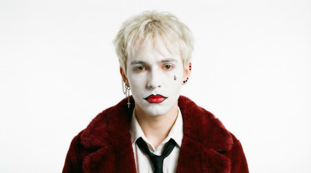 A studio portrait of a young individual with platinum blonde hair, white face paint, red lipstick, and a painted teardrop, wearing a plush red coat against a white background.