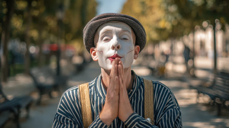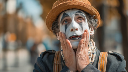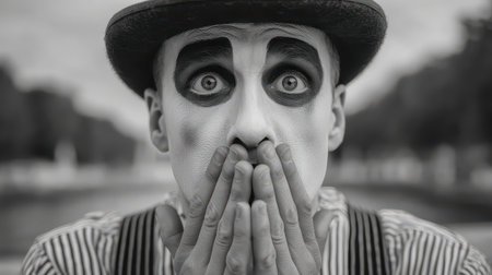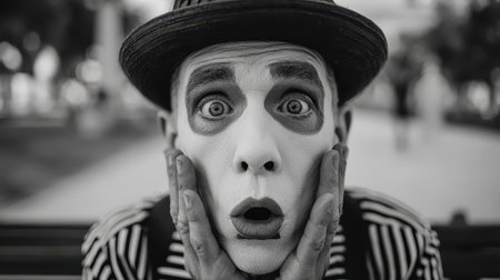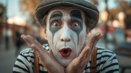 A surprised mime displaying a shocked expression with white face paint and a beret. This colorful portrait captures the essence of theatrical performance and emotion.