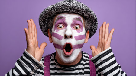 A surprised clown with purple makeup and a striped shirt shows an expressive emotion against a vibrant purple background, embodying fun and creativity.
