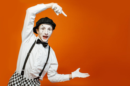 Emotional pantomime with white facial makeup showing empty space on the orange background, advertising something