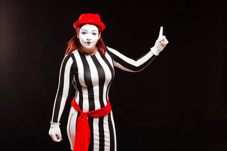 Portrait of female mime artist performing, isolated on black background. Woman in a striped dress is standing with raised hand. Symbol of attention, warning, nota bene