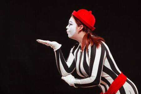 Portrait of female mime artist performing, isolated on black background. Woman blows a kiss posing in striped dress