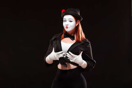 Portrait of female mime artist performing, isolated on black background. Woman touches her breast with confident look. Symbol of breast augmentation, big size